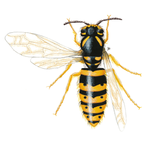 Schwarzer Kopf und schwarz-gelb gemusterter Hinterleib.