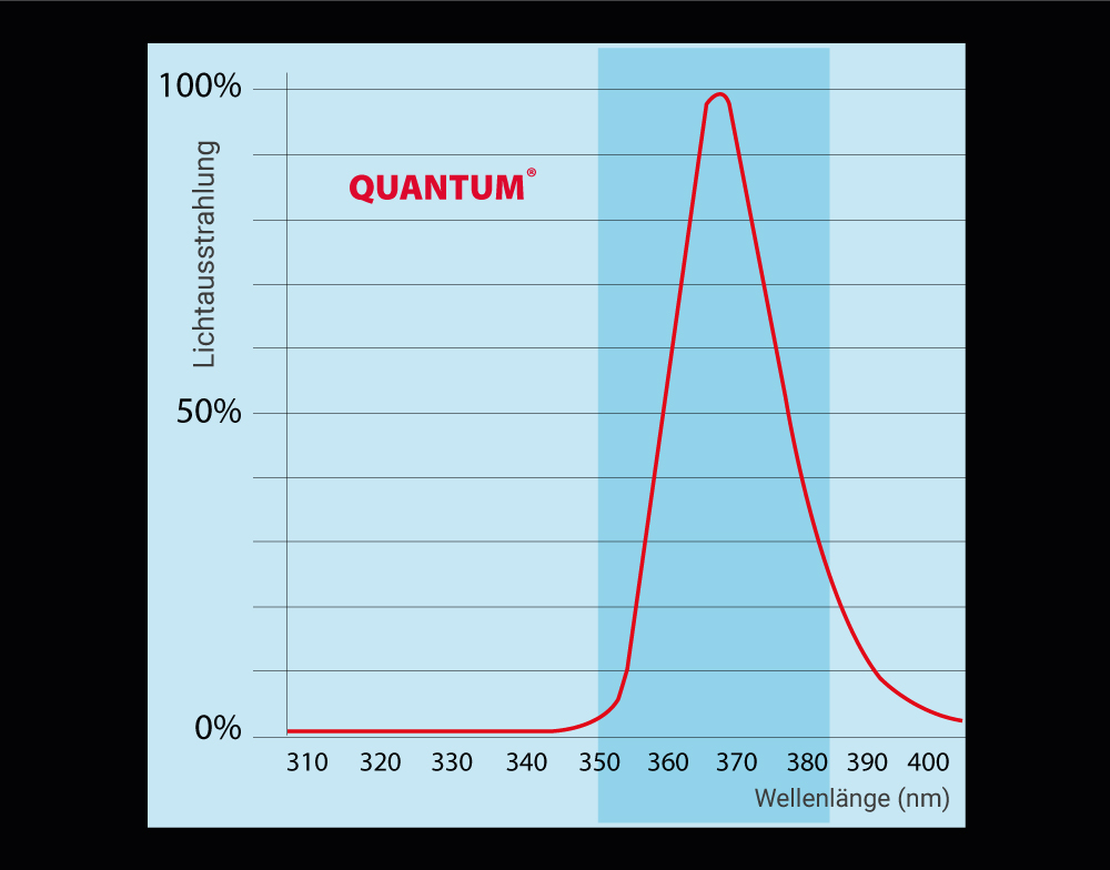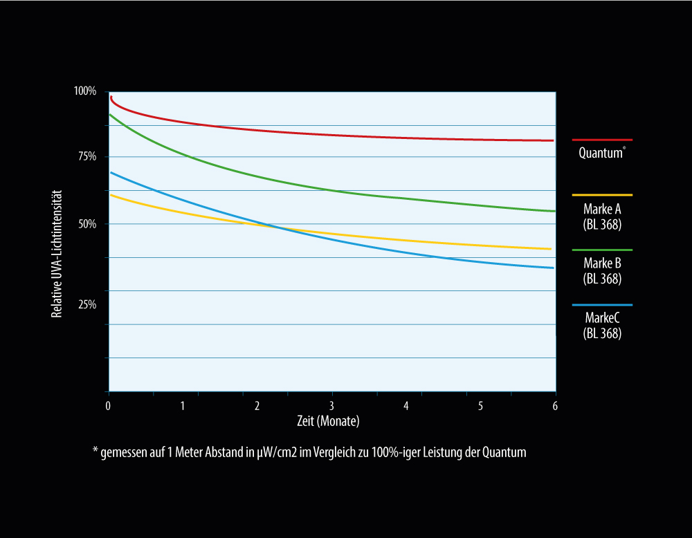 Die spezielle Phosphormischung der Quantum® Röhren und eine Qualitätskontrolle, die internationalen Standards entspricht, garantieren eine hohe anfängliche UVA Lichtausstrahlung, die auch über den gesamten Lebenszeitraum der Röhren sehr hoch bleibt (siehe Grafik unten).